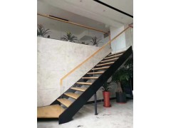钢板梯加钢化玻璃围栏,龙骨钢板,踏板材质实木,12毫米钢化玻璃,实木扶手